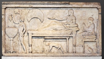 Conjunto de creencias, rituales y mitos propios de la Grecia antigua, que abarcaron un conjunto de prácticas culturales de todo tipo muy emparentadas con la mitología griega.Estela funeraria con la ...
