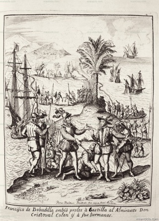 Francisco de Bobadilla envió presos a Castilla a Cristobal Colón y sus hermanos. Grabado de Antonio de Herrera.(¿?, reino de Aragón, ¿? — mar de las Antillas, 1502). Conquistador y administrador ...