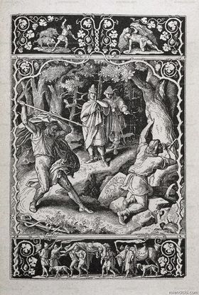 Poema épico, una canción de gesta de origen germánico, escrito hacia el año 1200 por un autor desconocido de la región austro-bávara.Representación de cómo Sigfrido fue asesinado. Grabado. El CANTAR ...