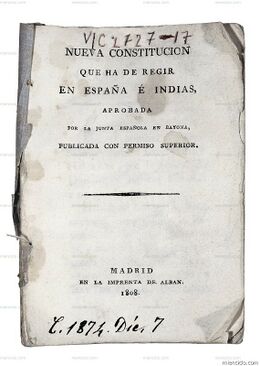 También conocida como Estatuto de Bayona. Texto legal español aprobado el día 6 de julio de 1808 por una Junta nacional de notables a la que concurrieron 66 personas, en la ciudad francesa de Bayona ...