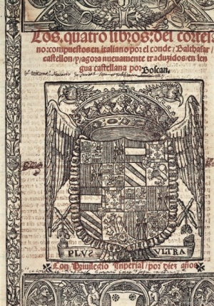 El Cortesano. Portada de la primera edición relizada en España, traducida por Juan Boscán e impresa en Barcelona (1534). Biblioteca de Cataluña, BarcelonaObra del prosista italiano Baldassare de ...