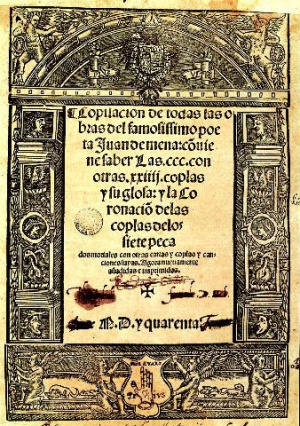 Juan de MenaPortada de una obra de Juan de Mena.Nacimiento1411Córdoba reino de Castilla (actual & 160;España)Defunción1456Torrelaguna reino de Castilla (actual Comunidad de Madrid &...